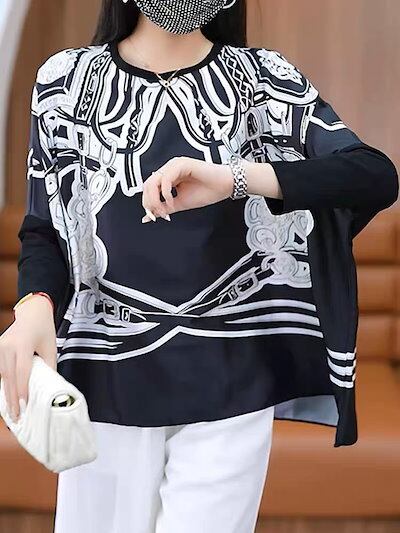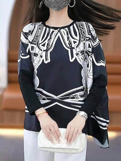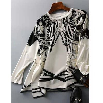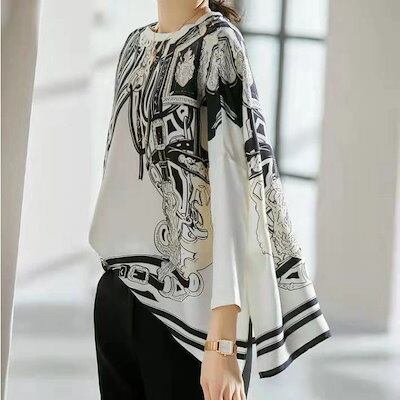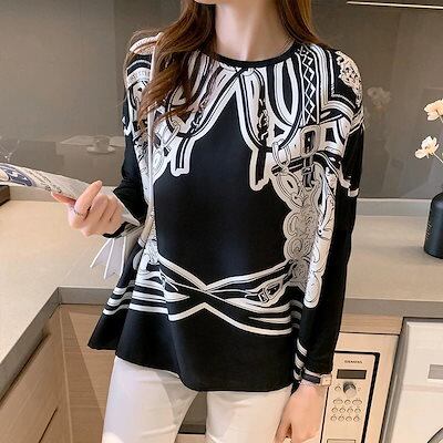 ラウンドネック スリーブ 長袖 プリント Tシャツ ブラウス レディース きれいめ 春秋 トップス 40代 春夏秋 長袖トップス 大きいサイズ オシャレ ブラウス tシャツ 花柄 韓国風 通勤 着痩せ