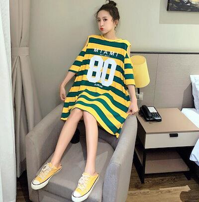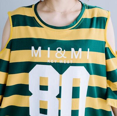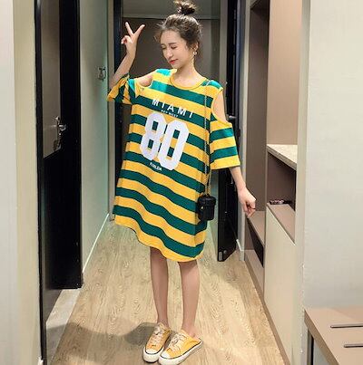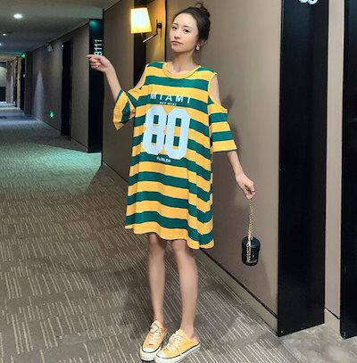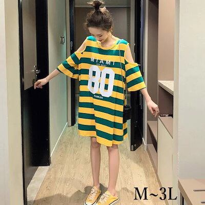 オフショルダーワンピース Tシャツワンピース レディース ミディアム オフショルダー 肩だし 膝丈 ロング 7分袖 半袖 肩出しワンピース ロゴ プリント ボーダー 大きめ オーバサイズ M L 2