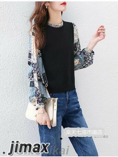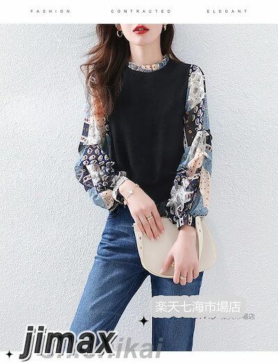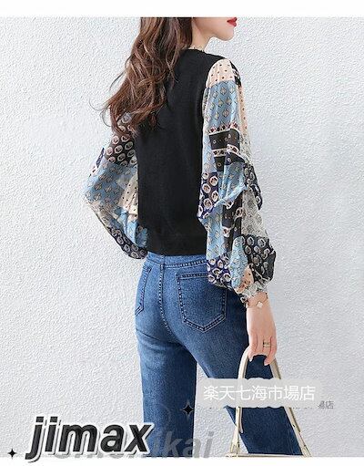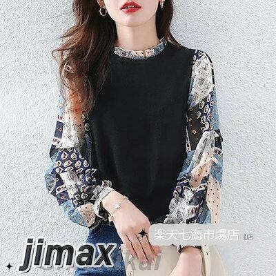 ニットTシャツ レディース 40代 秋服 長袖ニットソー オシャレ プリント切り替えニットトップス パフスリーブカットソー 大人 通勤 Tシャツ 韓国風 30代 50代