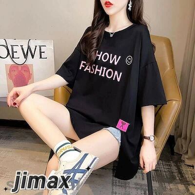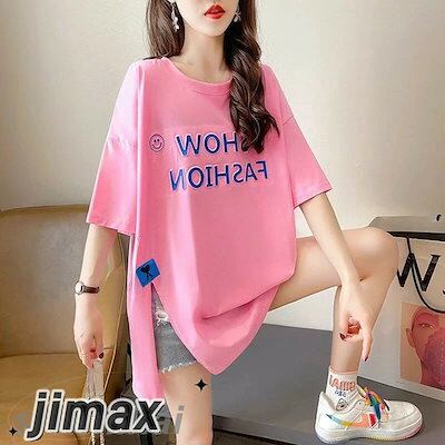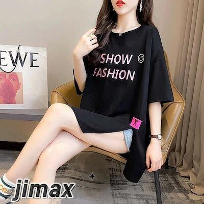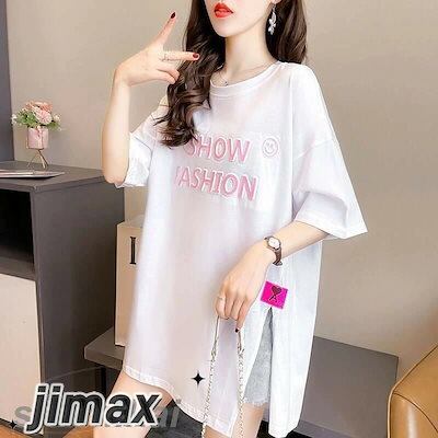 スリット Tシャツ レディース 半袖 おしゃれ トップス ロゴT カットソー プリント ゆったり 大きいサイズ 体型カバー 部屋着 カジュアル シンプル こなれ感 白 黒 大人 女性 ホワイトデー