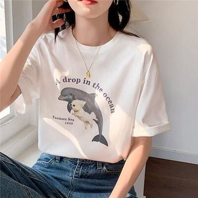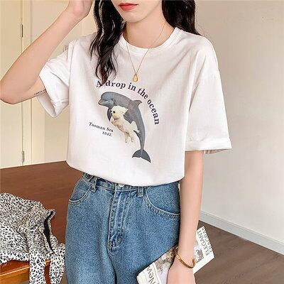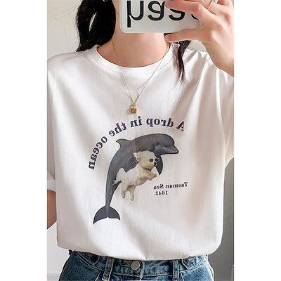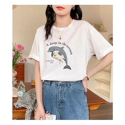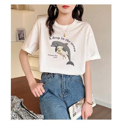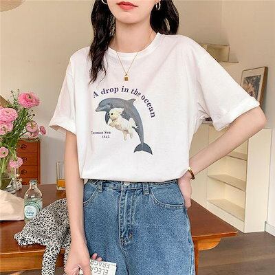 半袖tシャツ レディース 白 プリント ロゴ イルカ かわいい クルーネック 夏 半袖 カジュアル 白 カットソー かわいい 20代 30代 40代 バレンタイン 2023 プレゼント