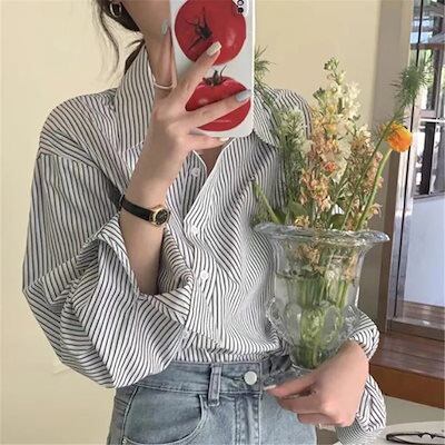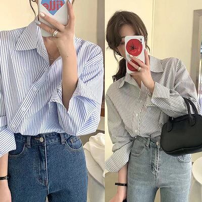 ブラウス 新作 イレギュラーデザイン ストライプブラウス レディース 韓国ファッション デザイン感百掛け 長袖トップス 着痩せシアーシャツ UVカット シフォンブラウスTシャツ