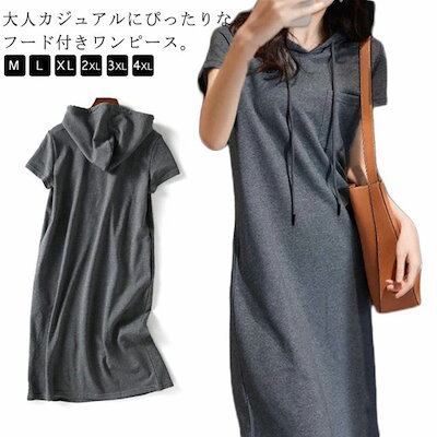パーカーワンピース 半袖 ロング丈 パーカー フード付き Tシャツワンピース プルオーバー レディース ロングワンピース スリム 大きいサイズ 部屋着 ルームウェア 春夏 ブラック グレー M L X
