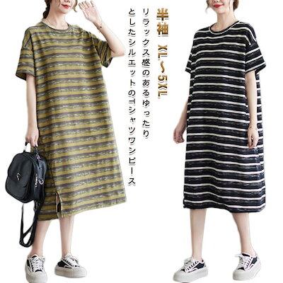 tシャツワンピース ロング Tシャツワンピース レディース 半袖 Tシャツワンピ 夏服 ボーダー柄 カジュアル ワンピース ロング丈 薄手 ルームワンピース 着痩せ 膝下 体型カバー カットソー 大き