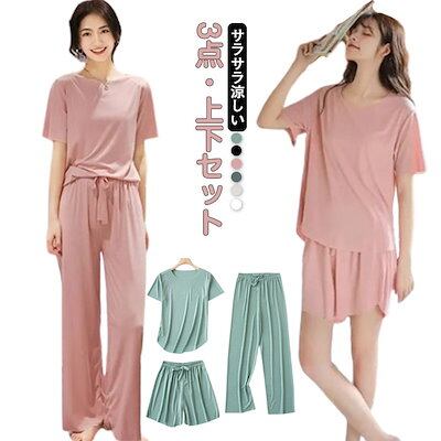 部屋着 3点セット 冷感 パジャマ 半袖 上下セット レディース ルームウェア アイスシルク Tシャツ ショートパンツ ロングパンツ ウエストゴム 女性 ルームウエア 夏 ナイトウェア 無地 寝間着