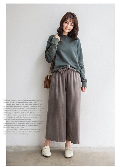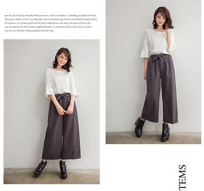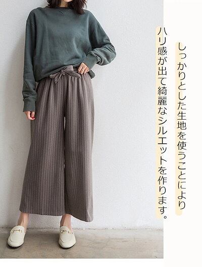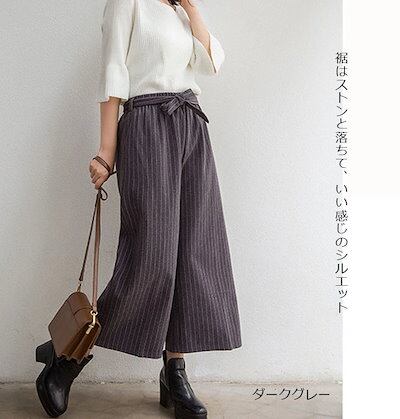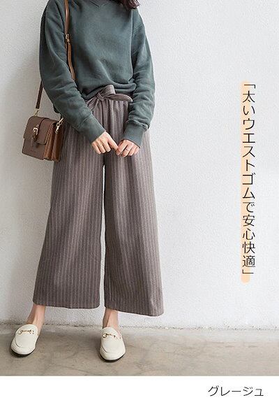 ワイドパンツ 秋冬 ガウチョパンツ 冬 9分丈 ゆったり ガウチョ ラシャ リボンベルト レディース イージーパンツ ロング丈 ウエストゴム 長ズボン ストライプ 大きいサイズ 秋 冬 楽チン 着痩せ