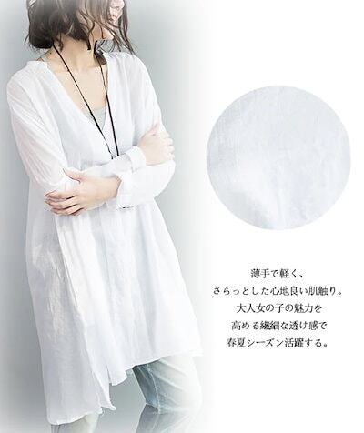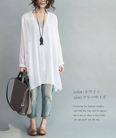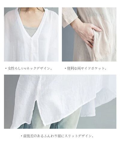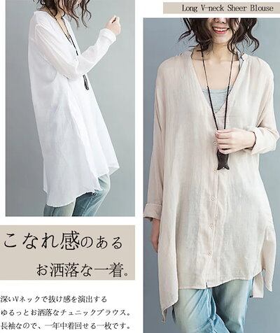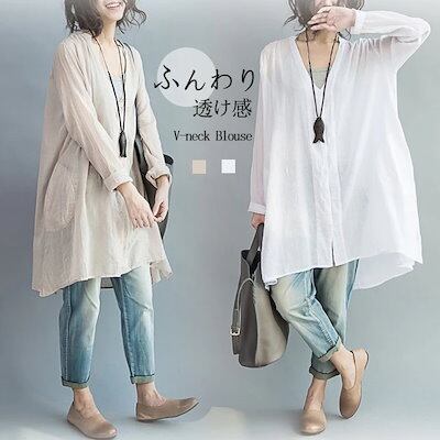 ロングシャツ レディース 羽織もの 夏 秋 ロング丈 シャツ チュニック 長袖 綿麻風 Vネック 不規則裾 スリット入り ポケット付き チュニックワンピース シャツワンピース 前開き ボタン止め カー