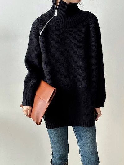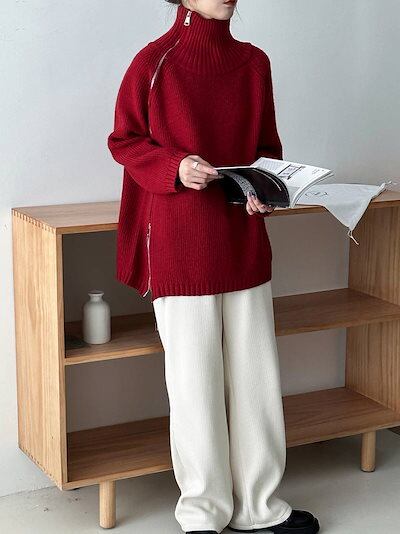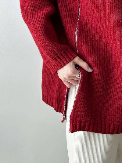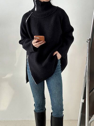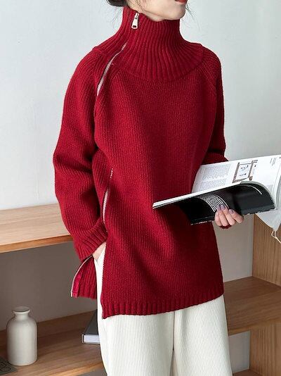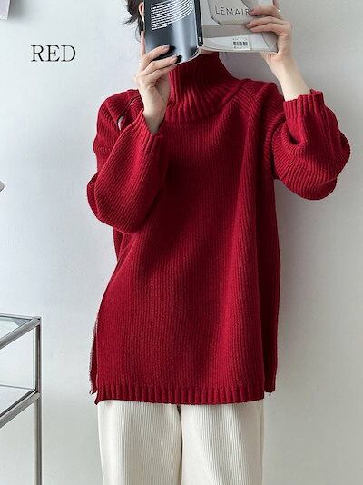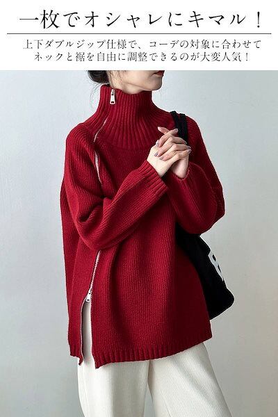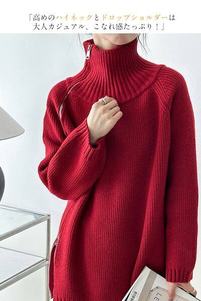 上下ジップ ニット タートルネック トップス レディース 秋冬 セーター ロングニット ビックシルエット ハイネック オーバーサイズ プルオーバー ドロップショルダー タートル お洒落 大きいサイズ