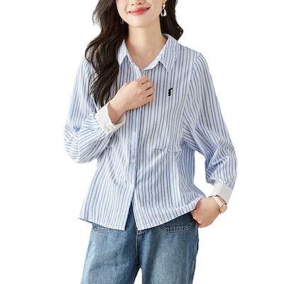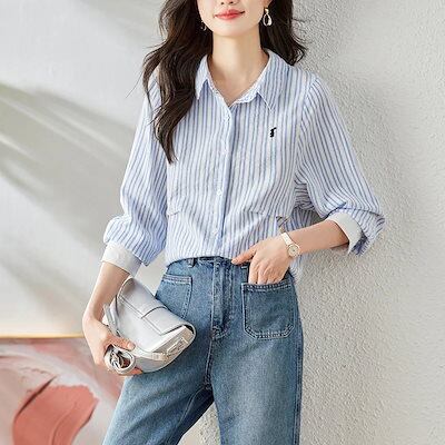 2025 春 夏 シャツ レディース ブラウス ストライプ シャツ 長袖 オフィス トップス 韓国ファッション