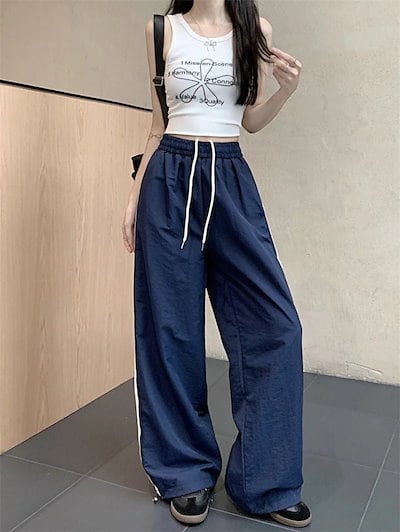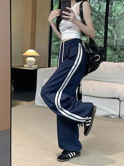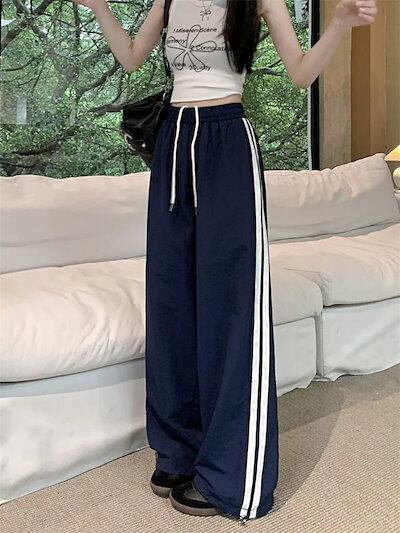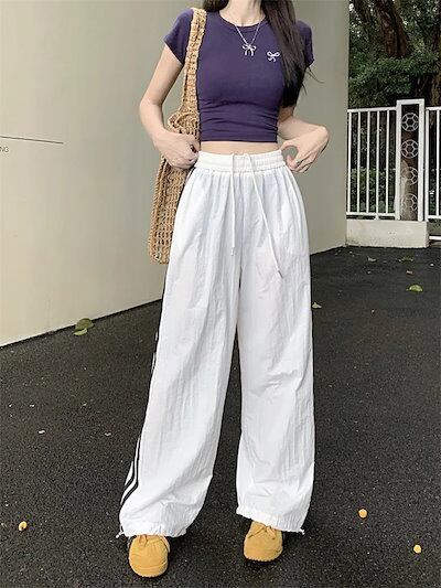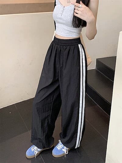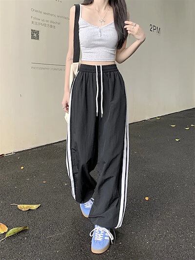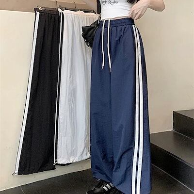 25 パンツ ロング丈 ワイド ストレート ストライプ ウエストゴム ハイウエスト 美脚効果 脚長効果 細見え 白 黒 おしゃれ かわいい 韓国ファッション レディース お出かけ
