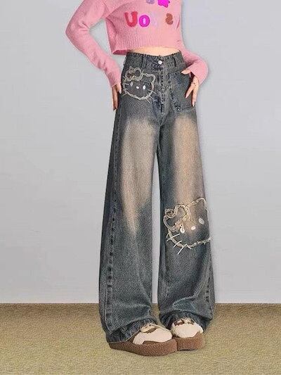 新着 ワイドパンツ ジーンズ レディース ジーパン キティちゃん ハイウエストデニム ズボンキティーちゃん パンツ デニムパンツ ダメージジーンズ 贈り物