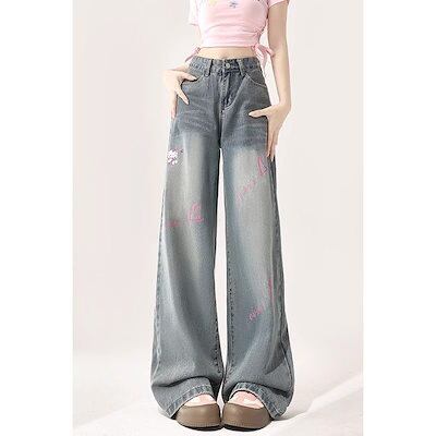 メガ割プリント レディース ハイウエスト ジーンズ ワイドレッグパンツ ゆったり デザインセンス ワイドパンツ1710