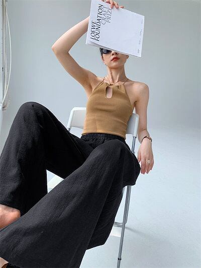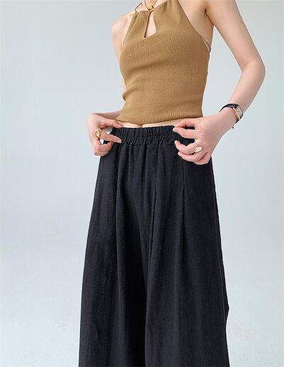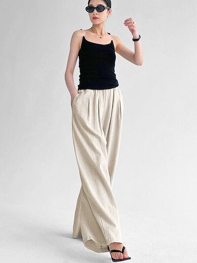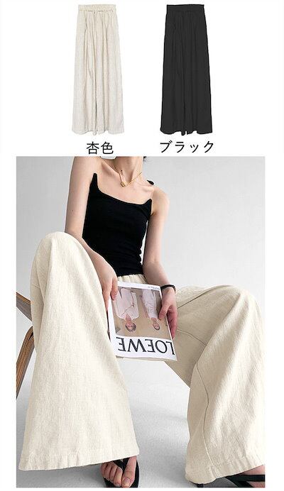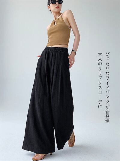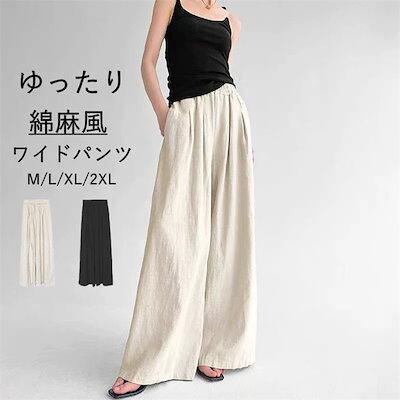 ワイドパンツ レディース ガウチョパンツ 綿麻風 リネンワイドパンツ ロングパンツ ウエストゴム ハイウエスト ゆったり 着痩せ カジュアル 体型カバー 無地 タックパンツ 長ズボン 美脚効