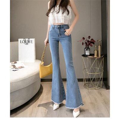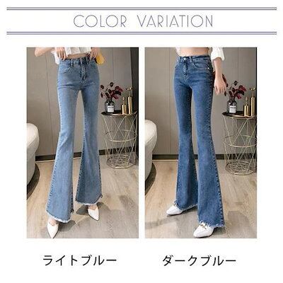 wusu0bici迅速な出荷フレアパンツ デニムパンツ レディース ハイウエスト ポケット付き 裾フリンジ 脚長効果 美脚 スリム ロングパンツ デニムズボン ベルボト 新作