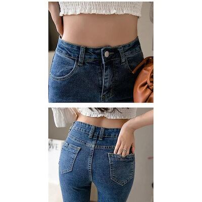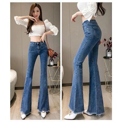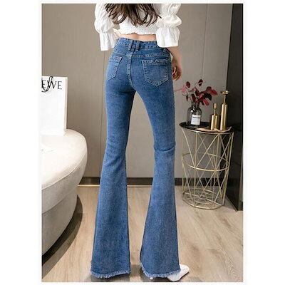 2枚購入で 2oo円FF!迅速な出荷フレアパンツ デニムパンツ レディース ハイウエスト ポケット付き 裾フリンジ 脚長効果 美脚 スリム ロングパンツ デニムズボン ベルボト 新作