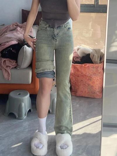 [cos衣料]レトロレトロレトロなマイクロフレアジーンズ女性の新型ビッグサイズ太mmハイウエストスリム梨型ボディパンツデニムボトムス 23 レディース