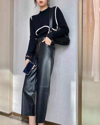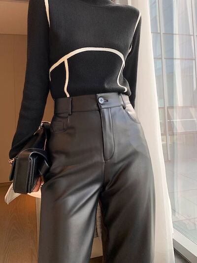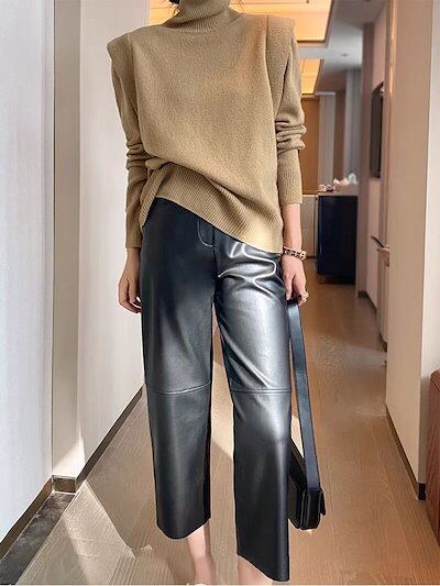 レザーパンツレディース新作PU皮プリーツハイウエストゆったりスリムストレートパンツ