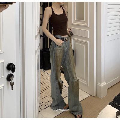 SUN11 ハンドラビング 破れジーンズ レディース アメリカンレトロ ストレートレッグ スリム ダメージ加工 フレア カジュアルパンツ