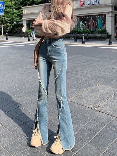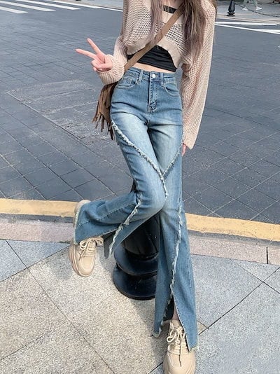 メガ割 大きいサイズ ハイウエスト スリム ジーンズ レディース 初 アメリカンスタイル レトロ スリット バリ デザイン フレア ロングパンツ 母の日wudamne