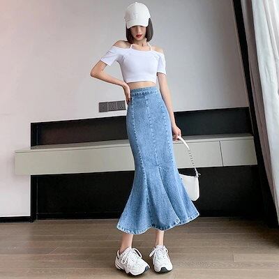 メガ割 ハイウエスト デニム スカート レディース 24 スリム デザイン ミッドレングス フィッシュテール スカート ヒップラップ付き 母の日wudamne