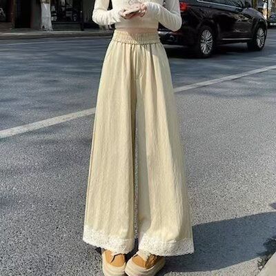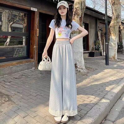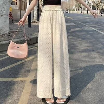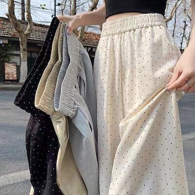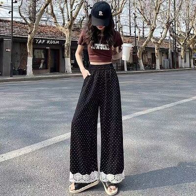 波点ストレートパンツ狭版ワイドパンツレディース夏レースステッチハイウエスト九分パンツ