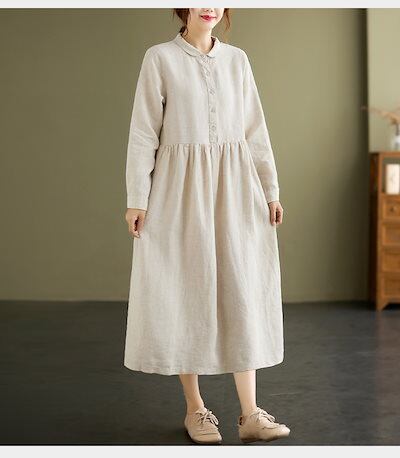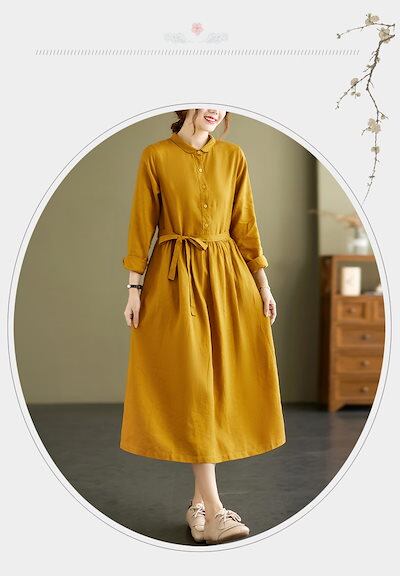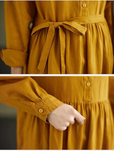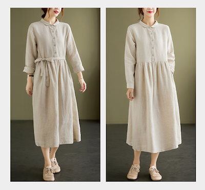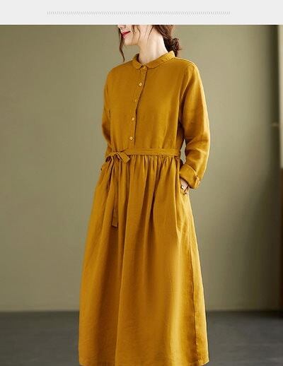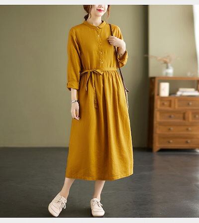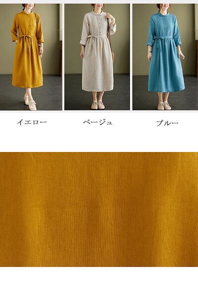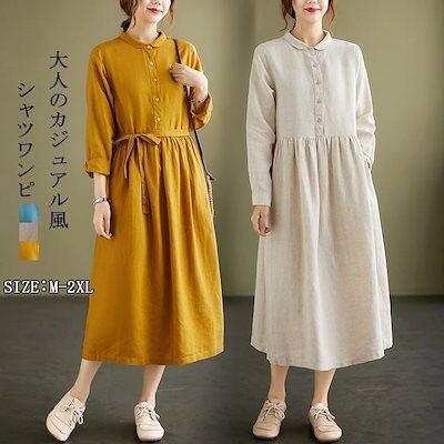 シャツワンピース レディース 春夏 秋 きれいめ リネン風ワンピース レディース ロングワンピ ワンピース ボタン留め 折り襟 シャツワンピ ロング丈 タック ギャザー ゆったり ウエスト紐付き シン
