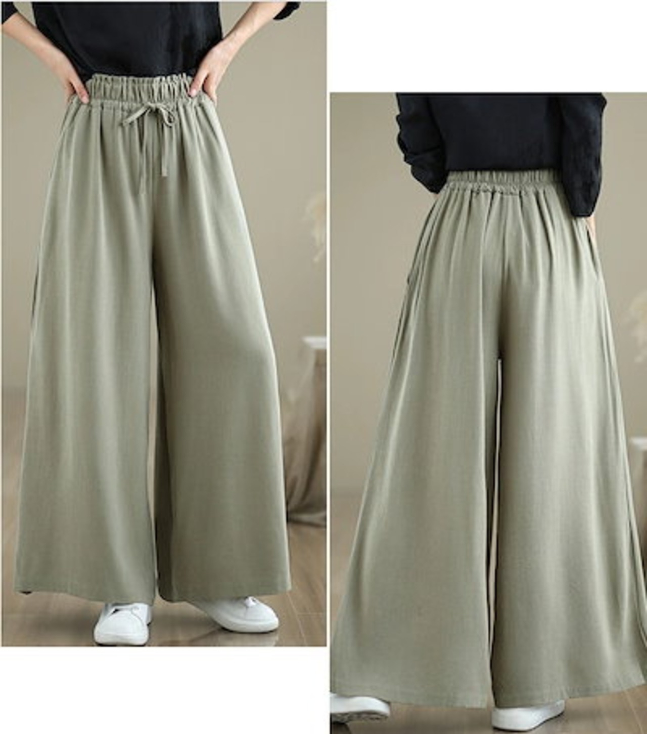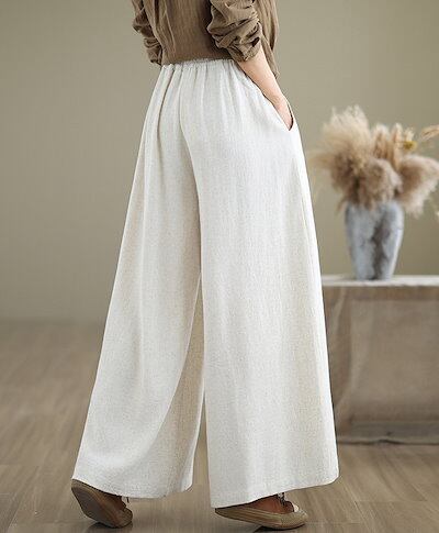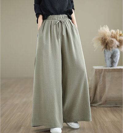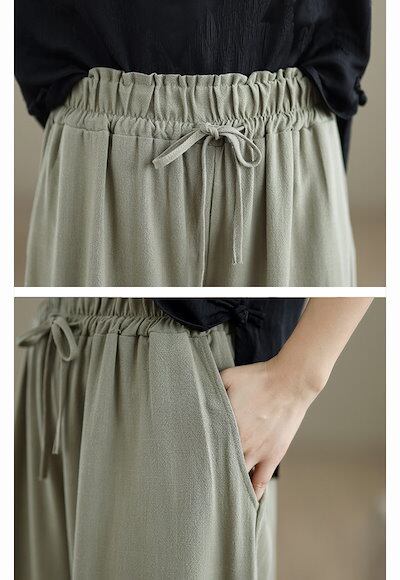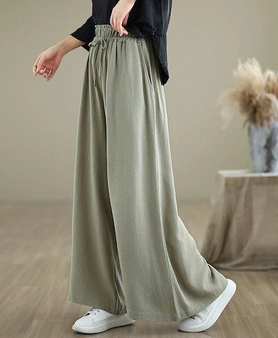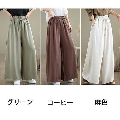 ワイドパンツ レディース ガウチョパンツ 綿麻 ウエストゴム ハイウエスト ポケット付き パンツスカート リボン フリル ゆったり リネンパンツ オフィス ボトムス ボリューム スカーチョ ワイド カ