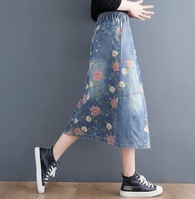 デニムスカート フレアスカート 花柄 ウエストゴム スカート デニム ダメージ ミモレ丈 ひざ丈 ロング Aライン ボトムス レディース 大きいサイズ L 2L 3L