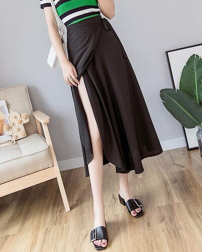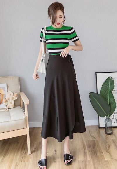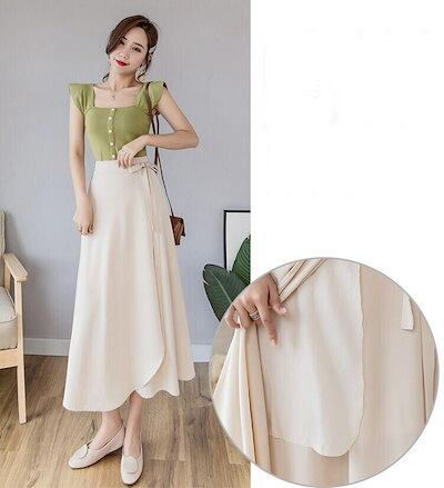 シフォン フレアスカート フリル ウエスト紐 ミモレ丈スカート スカート ひざ丈 ロング ミディアム フレア Aライン ハイウエスト 可愛い おしゃれ ボトムス レディース 体型カバー
