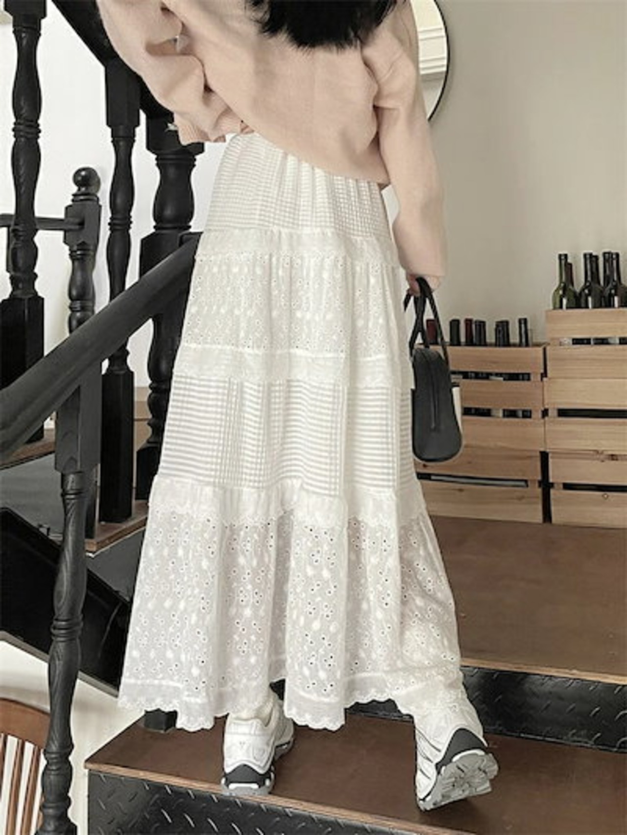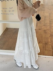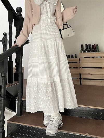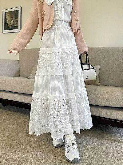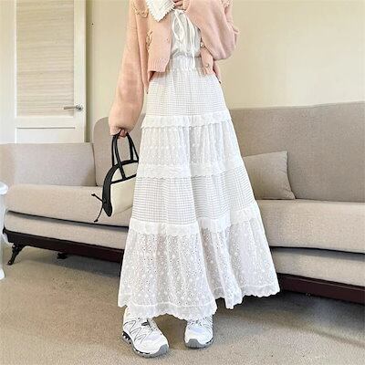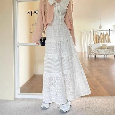 スカート レディース 春夏 切り替えスカート 切り替え Aライン フレア ロングスカート ロング丈 可愛い 透かし彫り ウエストゴム ハイウエスト ボトムス ガーリー ゆったり 体型カバー 着?せ 大