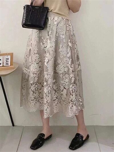 ロングスカート レディース 春 夏 秋 刺繍スカート チュールスカート ロング ボトムス マキシスカート スカート 大人 スカート レース 体型カバー フレア 裏地あり ウエストゴム フレアスカート