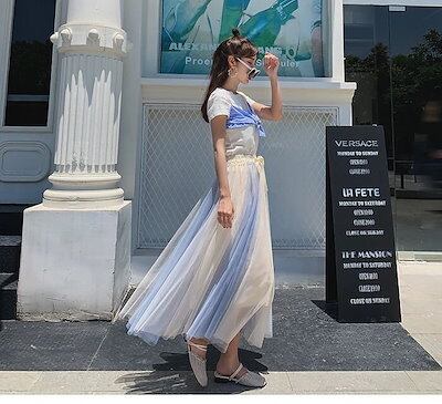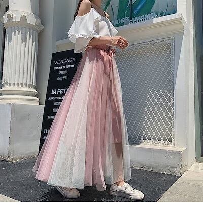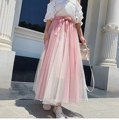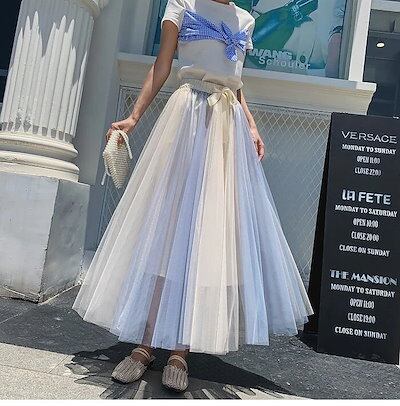 高レビュー配色チュールスカート ロング ウエストゴム ティアードスカート 無地 レディース 大人 裏