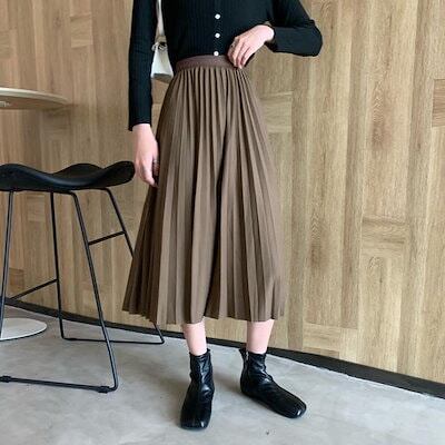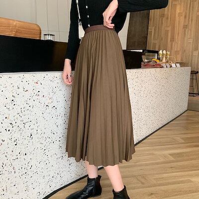 プリーツスカートロングスカートレディース女性ボトムスロング丈ミモレ丈ゴムウエストAライン無地ブラックブラウンベージュシンプル