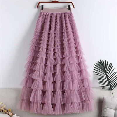 ティアードスカートレディースボトムスロング丈フレアスカートティアードスカートルスカートかわいいAラインフレアウエストゴム体型カバーおしゃれゆったりカジュアル3554