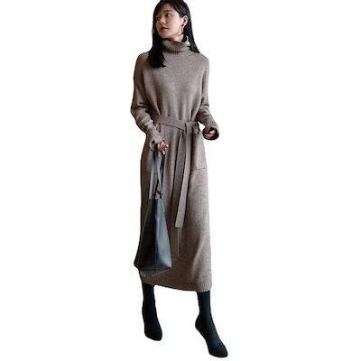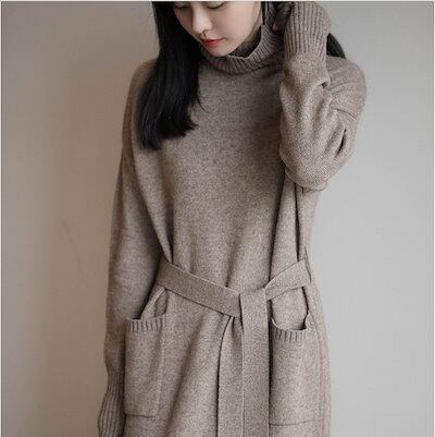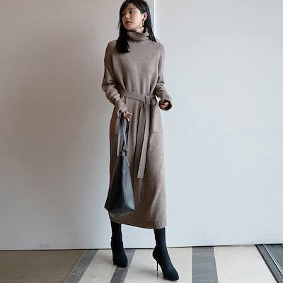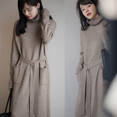 ニットドレス ワンピース パーティードレス 韓国ファッション ゆったり気質ウエストレースアップニットワンピース2024秋冬新作ハイネックロングニット無地ワンピース