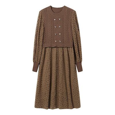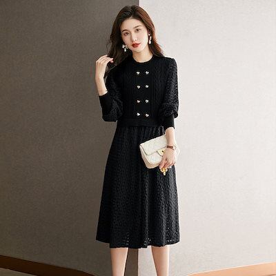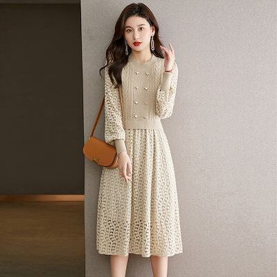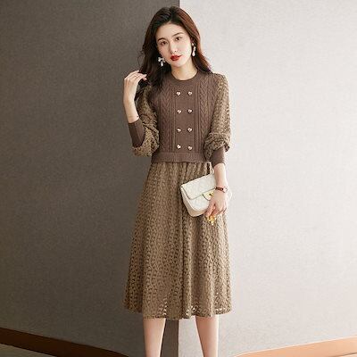 ニットドレス ワンピース パーティードレス 韓国ファッション 韓国ニットフェイクツーピースドレス2024秋冬新作ファッションハイウエストランタンスリーブロングセータードレス