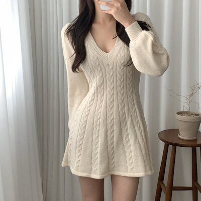 ニットドレス ワンピース パーティードレス 韓国ファッション 上質ツイストニットワンピース レディース 2024秋冬新作 ランタン ミドル丈 ウエストvネックセーター