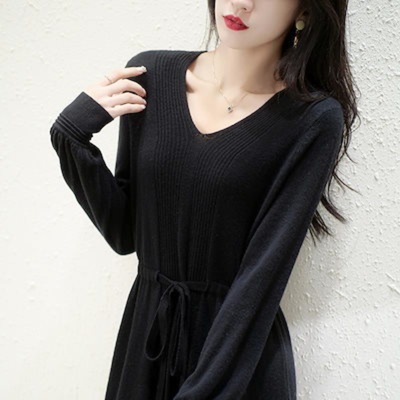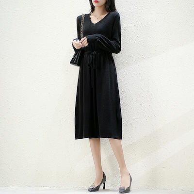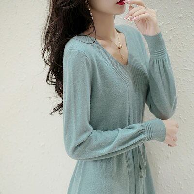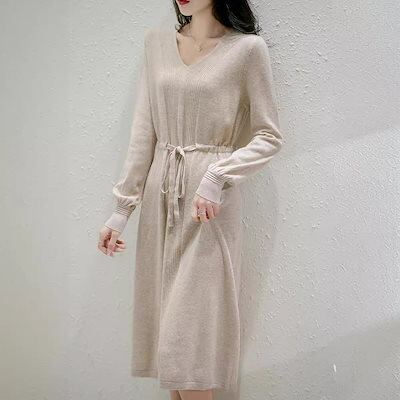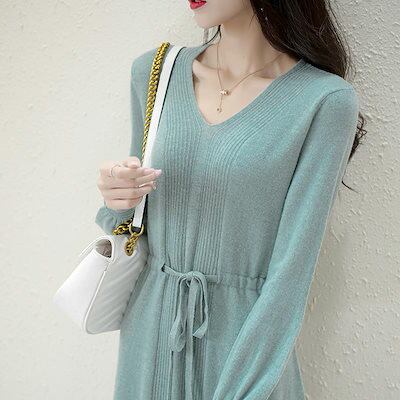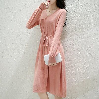 ニットドレス ワンピース パーティードレス 韓国ファッション vネックニットワンピース2024秋新作無地ウエストミモレ丈セーターワンピース