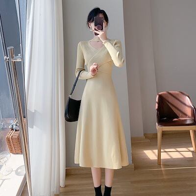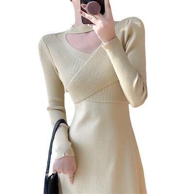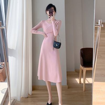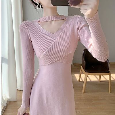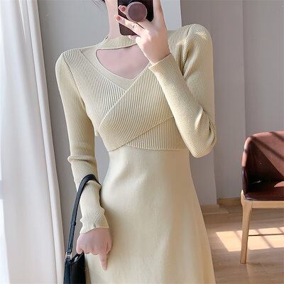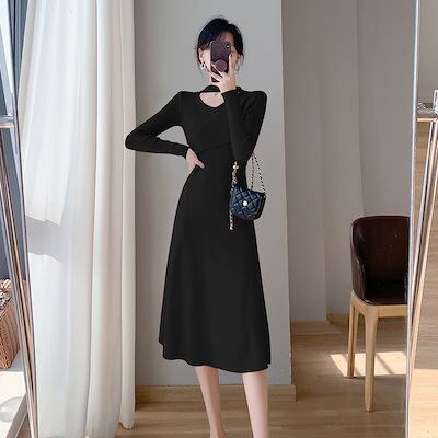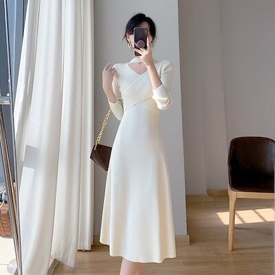 ニットドレス ワンピース パーティードレス 韓国ファッション ホールネックニットワンピースレディース2024秋冬新スタイルウエスト痩身ボトムミディ丈スカート