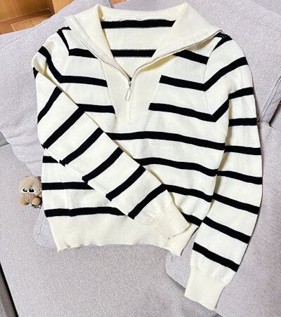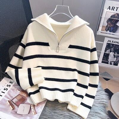 ベーシックニット ニットウェア レディース ジャンパー 秋冬 厚手 ジップ ストライプ トップス