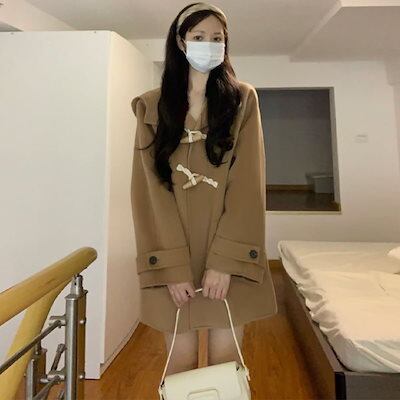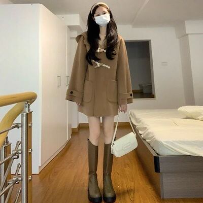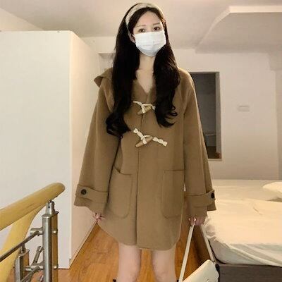 チェスターコート 冬アウター ショートフード付きレトロカレッジスタイル ラインウールコート女性用 冬新作ウールコート小柄な人向け 韓国ファッション