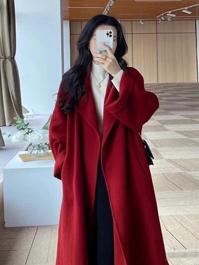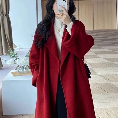 チェスターコート 冬アウター レッドウールコートレディースミドル丈 秋冬新作レディースベルトゆったり高級感ウールコートトレンド 韓国ファッション