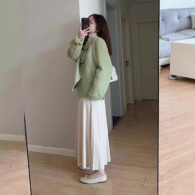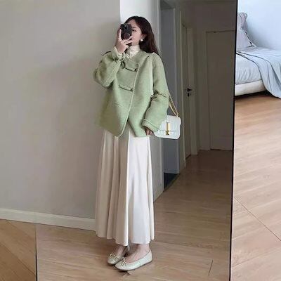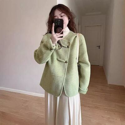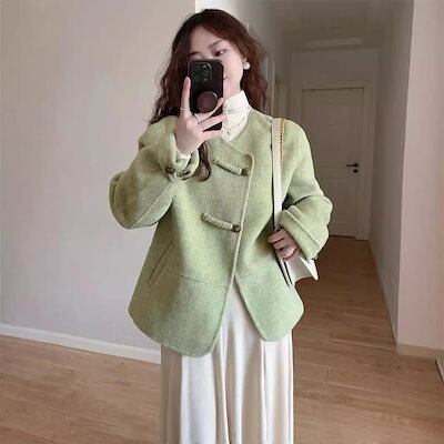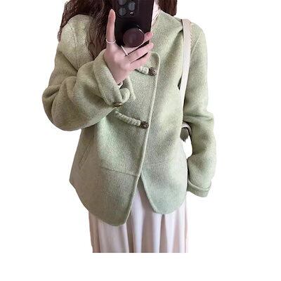 大人っぽチェスターコート 冬アウター 秋冬の女性用グリーンボタンコート新しいレトロルーズラウンドネックショート両面ウールコート 韓国ファッション
