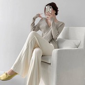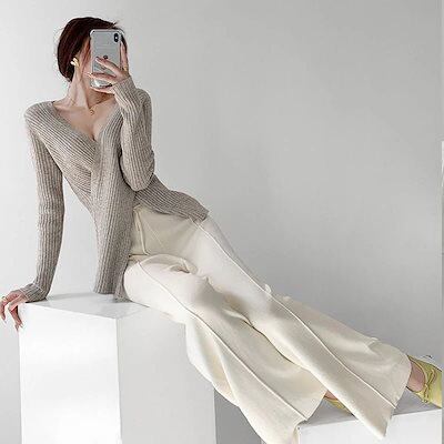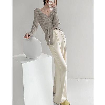 今年の流行 ニットパンツ 秋冬 厚手 ワイドパンツ ハイウエスト 着痩せ 美脚 ドレープ感 ストレート ドローストリング カジュアル モッピングパンツ スラックスパンツ