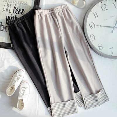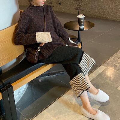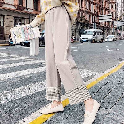 韓国 秋冬 新作 ラシャ 厚手 チェック カジュアル ワイドパンツ ドレープ感 ハイウエスト 美脚 着痩せ 九分丈パンツ