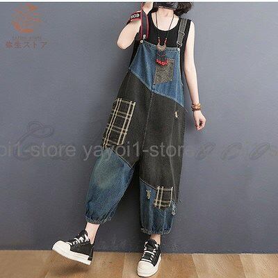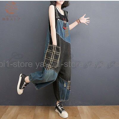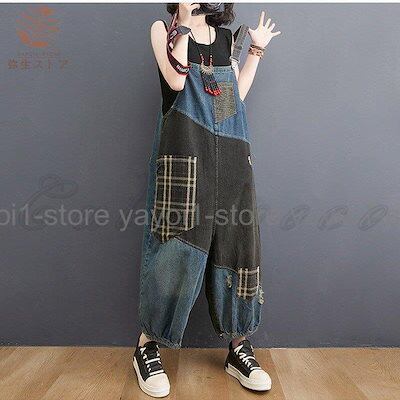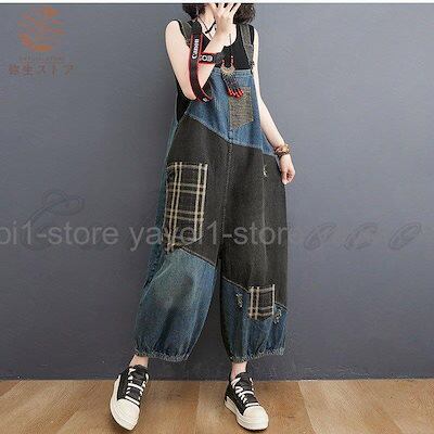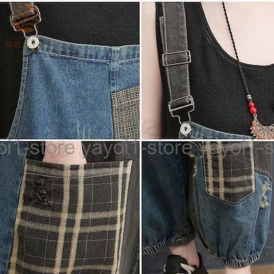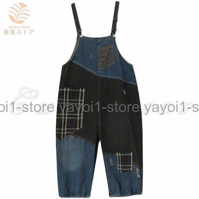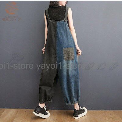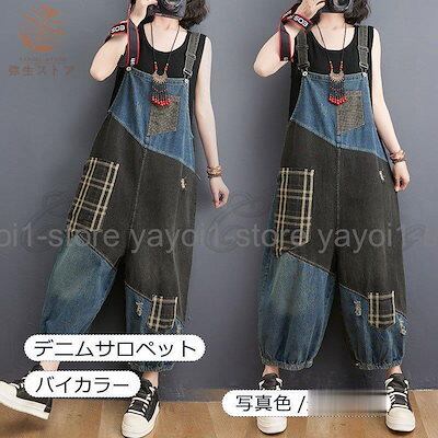[即納]デニムサロペット レディース ロングパンツ オーバーオール オールインワン バイカラー ハイウエスト ポケット付き 体型カバー 春夏秋 おしゃれ