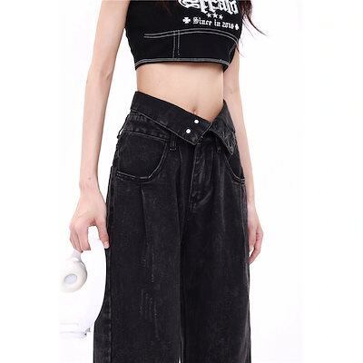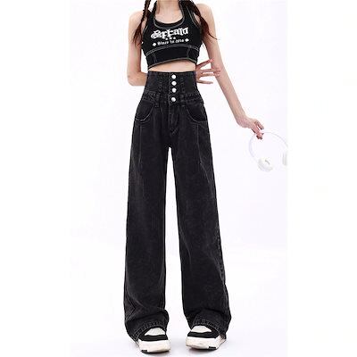 黒ワイドジーンズレディース秋の作アメリカンハイウエストゆったり着やせ感モップパンツ