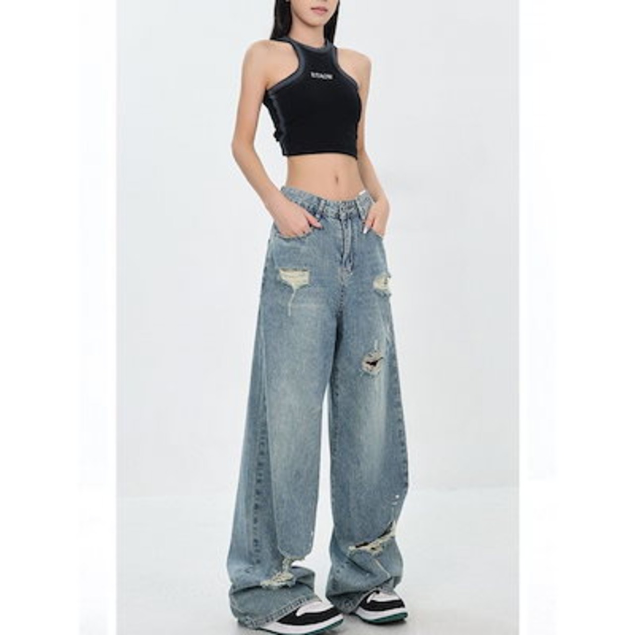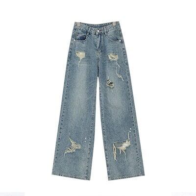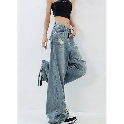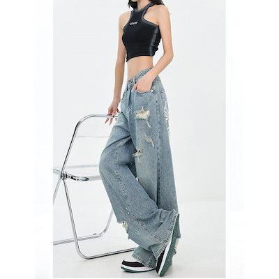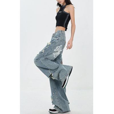 アメリカのプリントの穴が開いたストレートジーンズは秋の夏に痩せている