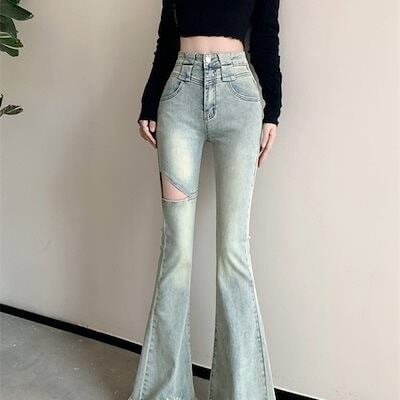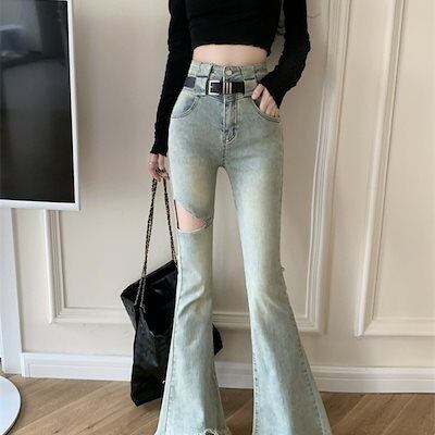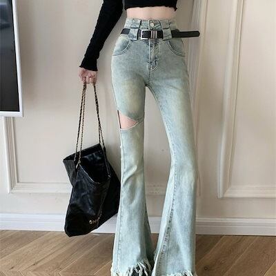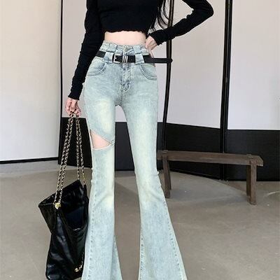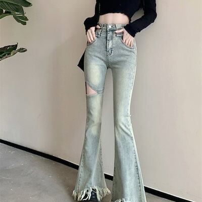 腰が高くて痩せているジーンズのストレートパンツがレトロな破れたズボンのマイクロラッパズボンの女性の新製品を修理している