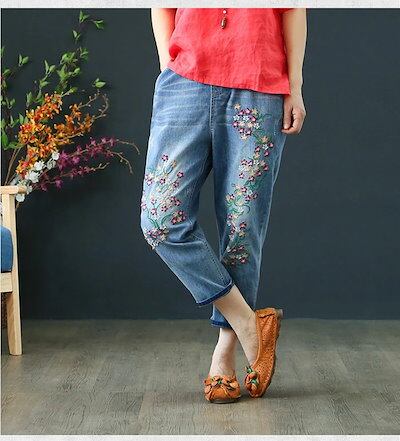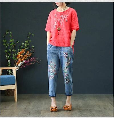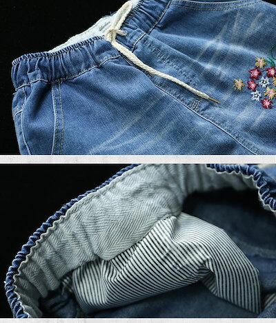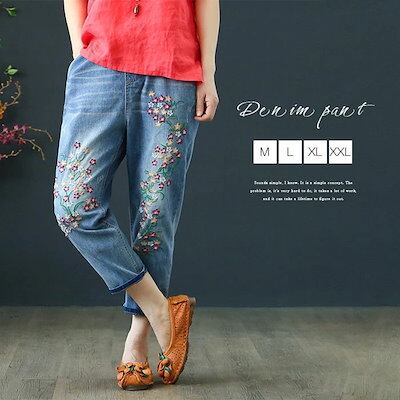 デニムパンツ レディース 大きいサイズ サルエル ジーパン サルエルパンツ ジーンズ デニム パンツ アンクル丈 カジュアル パンツ ボトムス ゆったり バイカラー ウエストゴム 楽チン 刺繍 無地